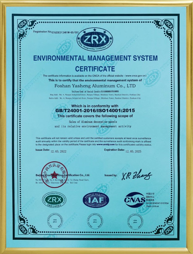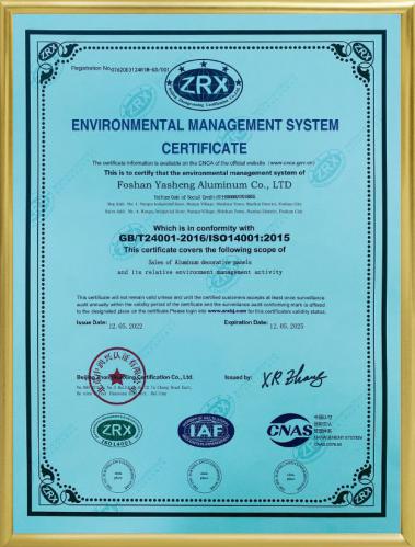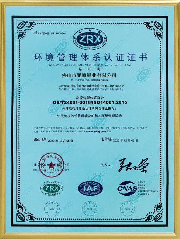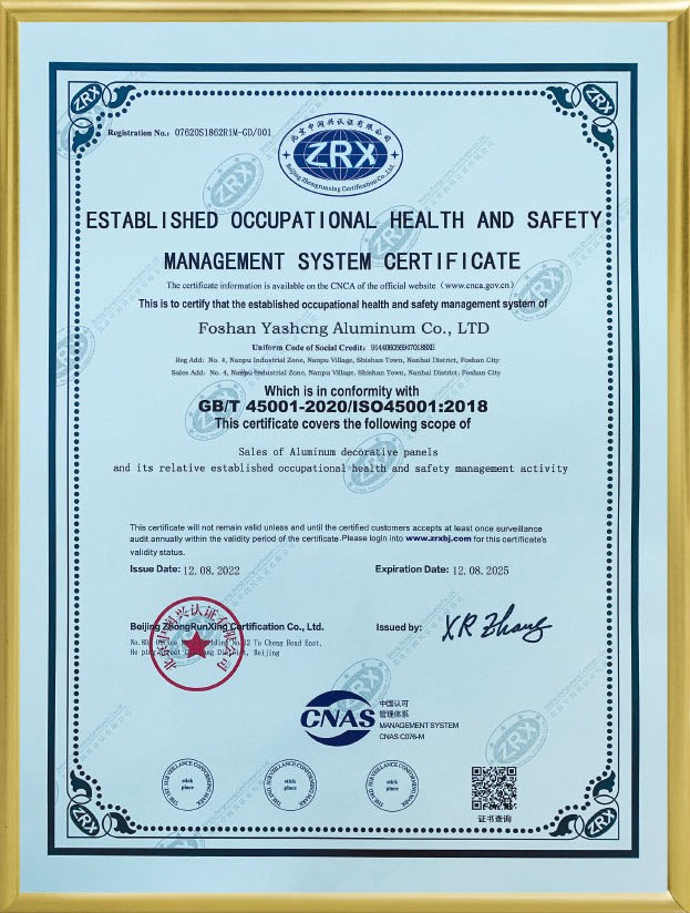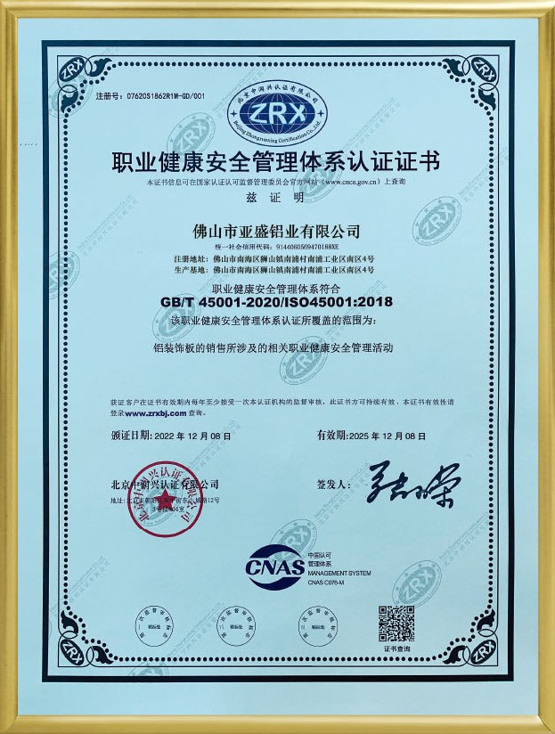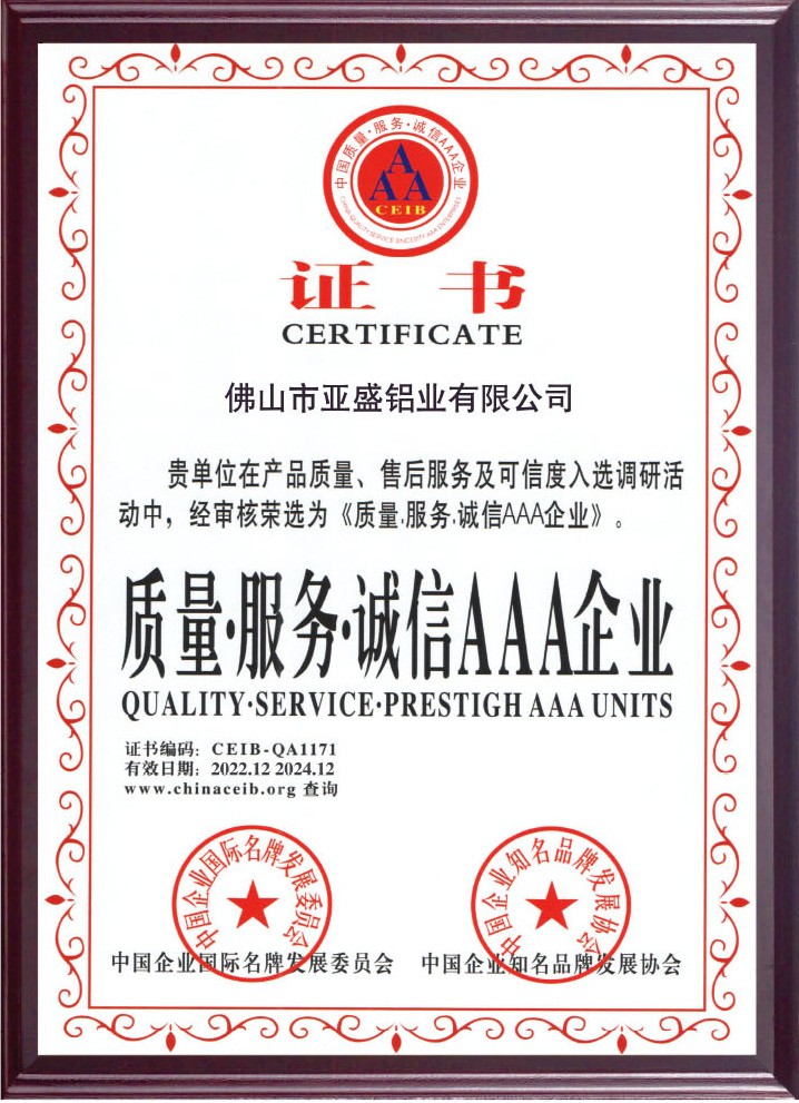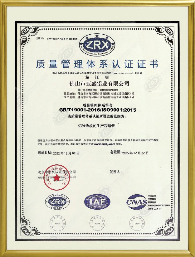 公司現已全面通過ISO9001:2008國際質量管理體系認證。鋁單板和鋁蜂窩板的產品質量均通過了國家建材測試中心檢測。涂層質量技術已達到美國AAMA2605的要求。板材的物理性能和其他質量技術指標均達到美國ASTM標準。公司本著“重質量、重誠信、重創新、重服務”的理念,堅持用戶至上,服務周全原則,用心解決客戶所憂;以科技和優質產品服務客戶;始終堅持以“想顧客之所想,急顧客之所急”的經營理念,不斷開拓創新,與時俱進,使“亞盛”品牌系列產品得到市場、客戶和專家的一致認可和深受廣大國內外客戶的好評。